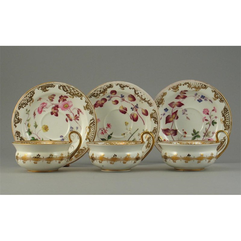 Three Coalport teacups and saucers, painted with wild flowers and strawberries, attributed to William Pollard. Some wear. c.1820. (6)