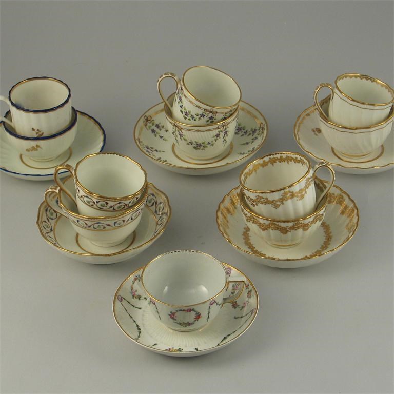 Five Derby trios, and a good Derby cup and saucer, variously decorated with flowers and sprigs, 18th/early 19th century. (17)