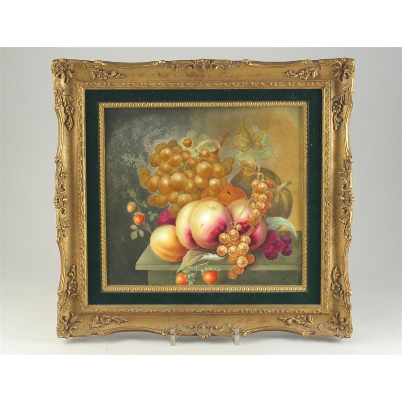 An English porcelain rectangular plaque, painted with grapes, peaches and other fruit, all within a gilt frame. Some deterioration to the enamels. 19th century, 21.5cm. x 23cm