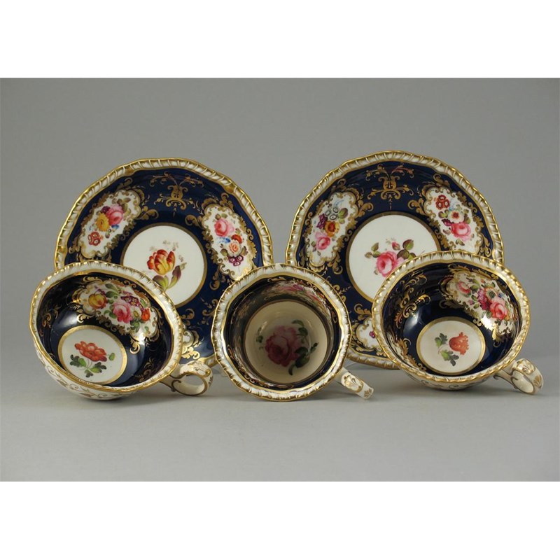 A pair of H & R Daniel trios, and six matching cups and saucers, all decorated with flowers on a blue ground, pattern No.4065, c.1826. (18)