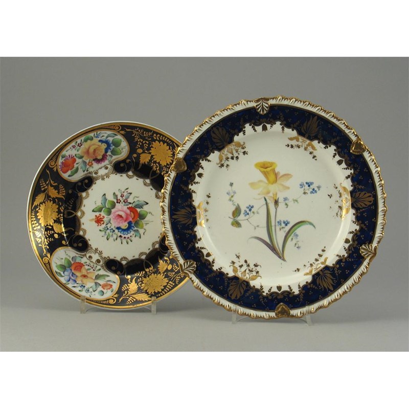 A Coalport plate, painted with a daffodil within a gilded blue border, ex Bill Dickenson collection, and a New Hall saucer dish, pattern No.2054, both early 19th century, 23.5cm. (2)