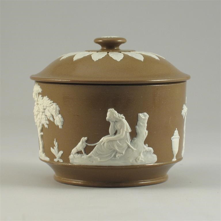 A Spode brown stoneware sugar bowl and cover, sprigged with figures and trees, Spode impressed, c.1820, 10.5cm. (2)