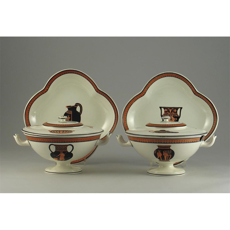 A pair of Wedgwood pearlware tureens and covers, with matching quatrelobed dishes, decorated with Greek vases, impressed marks, early 19th century, 22cm. (6)