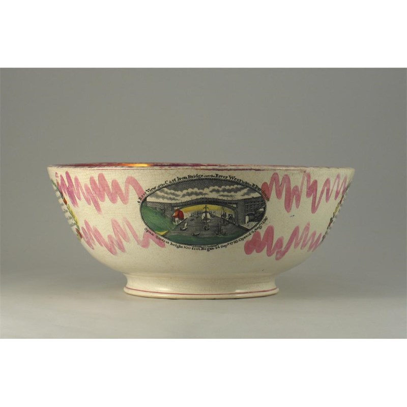 A Moore & Co. pink lustreware bowl, printed with the Sailors' Farewell, the cast iron bridge over the river Wear and various vignettes of verse. Some staining to the glaze. 19th century, 32cm.