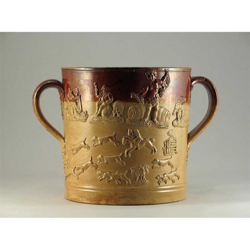 A massive brown stoneware loving cup, applied with huntsman, hounds and bucolic reliefs. Cracked and with rivets. 1st half 19th century, 34cm. Wide.