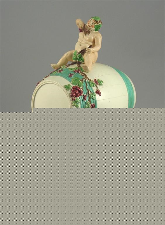 An unusual creamware spirit barrel, the removable lid modelled as Silenus, the barrel moulded with a fruiting vine, raised on a detachable flared foot. Minor restoration. Early 19th century, 42.5cm. (3)