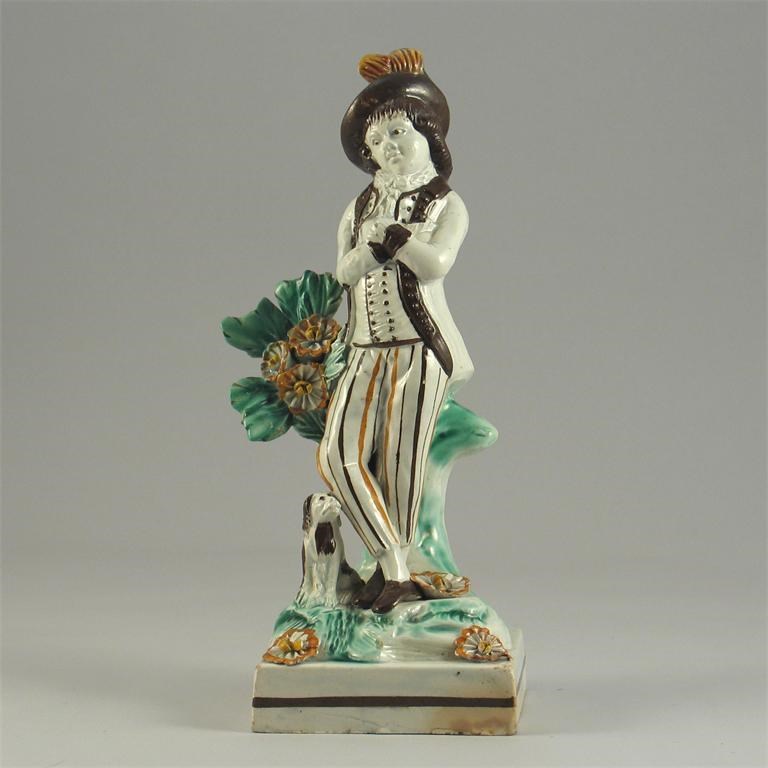 A Prattware figure of a young man, standing beside a flowering bush with a small dog at his feet. Some re-touching to his hat and to the leaves. Early 19th century, 24cm.