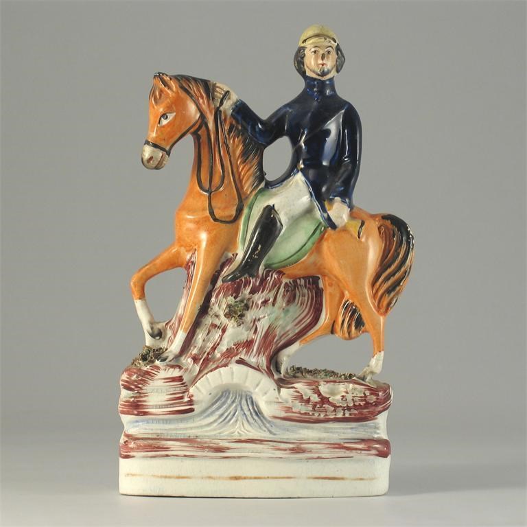 A Staffordshire model of a huntsman, mounted on his horse. Restoration to the neck. Mid 19th century. 22cm.