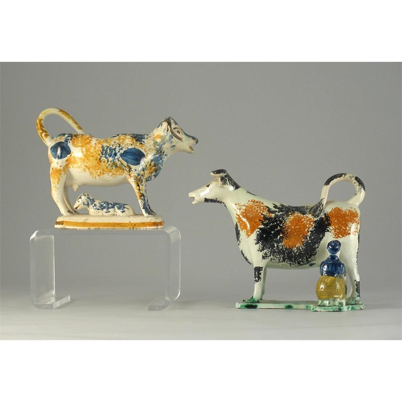 Two Pratt type pearlware cow creamers, one with a calf, the other with a milkmaid, decorated with yellow, blue, ochre and black patches. The smaller cow restored. Both early 19th century. 17cm. (2)