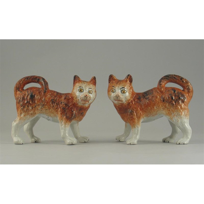 A pair of Staffordshire models of ginger cats, standing with their tails curled around their backs, late 19th century, 15.5cm. (2)