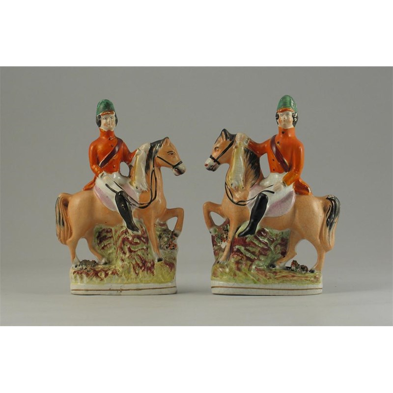 A pair of Staffordshire huntsman, mounted and holding hares, 19th century, 19cm. (2)