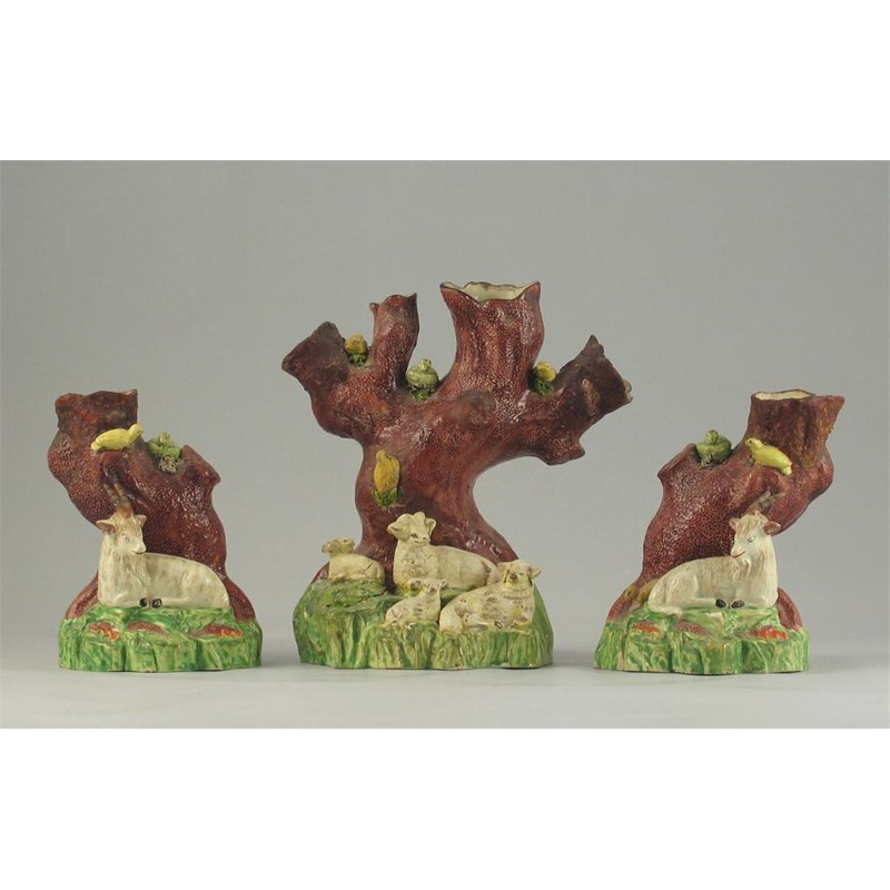 Three Staffordshire spill vases, modelled with goats and sheep seated before tree trunks. All damaged. 19th century, 19.5cm. (3)