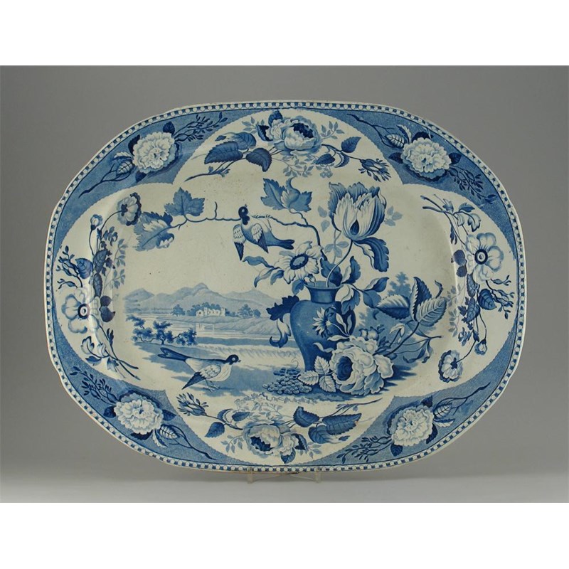 An 'Opaque China' blue printed meat plate, decorate with birds and a large vase of flowers, printed mark, c.1820, 54cm.