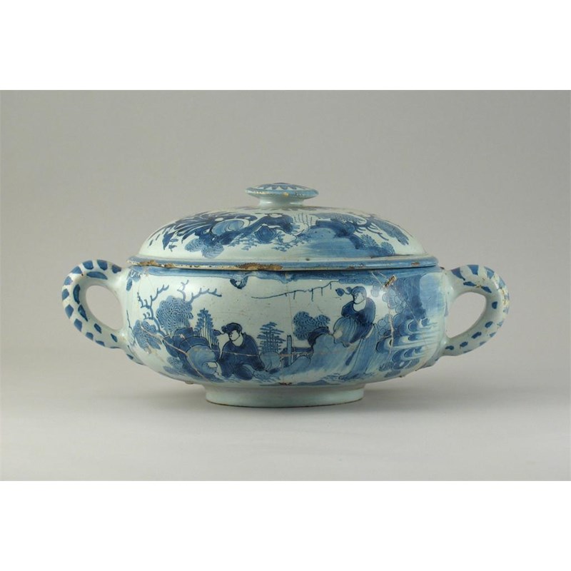 A Dutch Delft blue and white strainer bowl and cover, painted with Chinese figures sitting amongst rocks and trees. Damaged. Late 17th century, 29.5cm. (2)