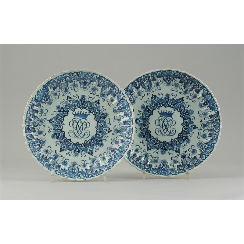 A pair of Dutch Delft blue and white fluted dishes, the centres decorated with crowned monograms, encircled by Baroque floral borders, 'AR' monograms, probably 19th century, 16.5cm. (2)