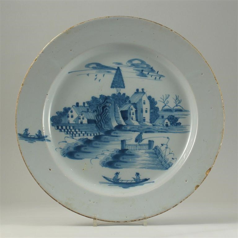 An English Delft blue and white plate, painted with a figure fishing and further figures in boats before a group of cottages, 18th century, 32.5cm.