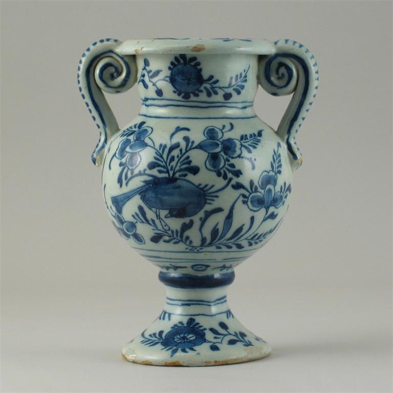 A Dutch Delft two handled vase, painted in blue with two birds perched on flower stems. Restored chips to the rim and foot. 18th century, 18.5cm.