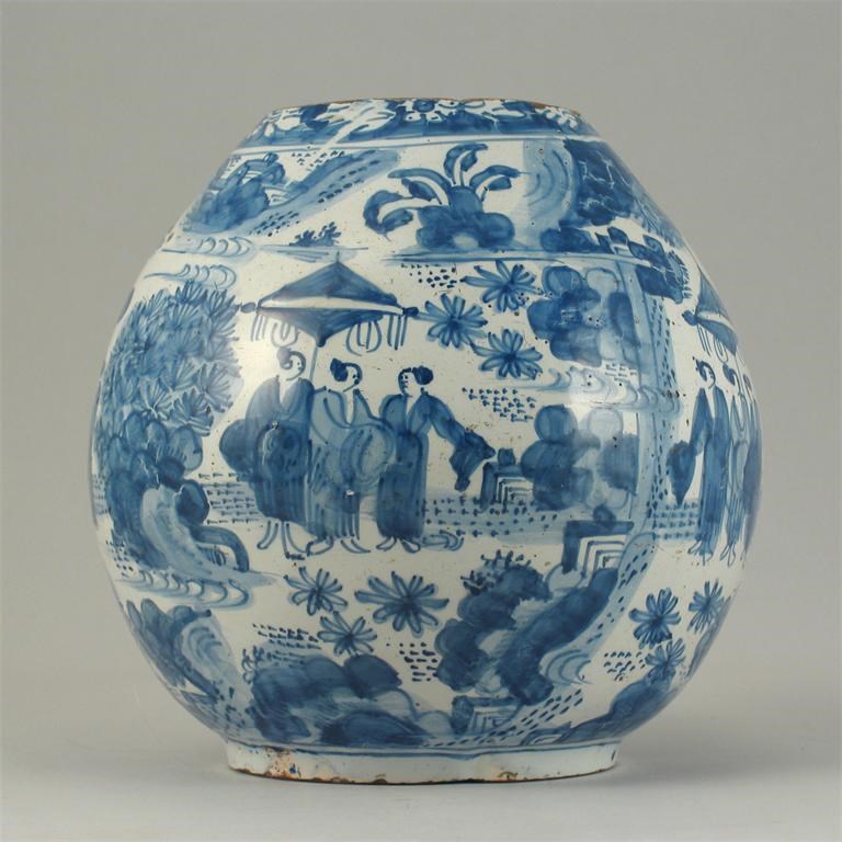 A Delft blue and white ovoid vase, decorated with Chinese figures amidst trees and flowers. The neck lacking. Late 17th/early 18th century, 17cm.