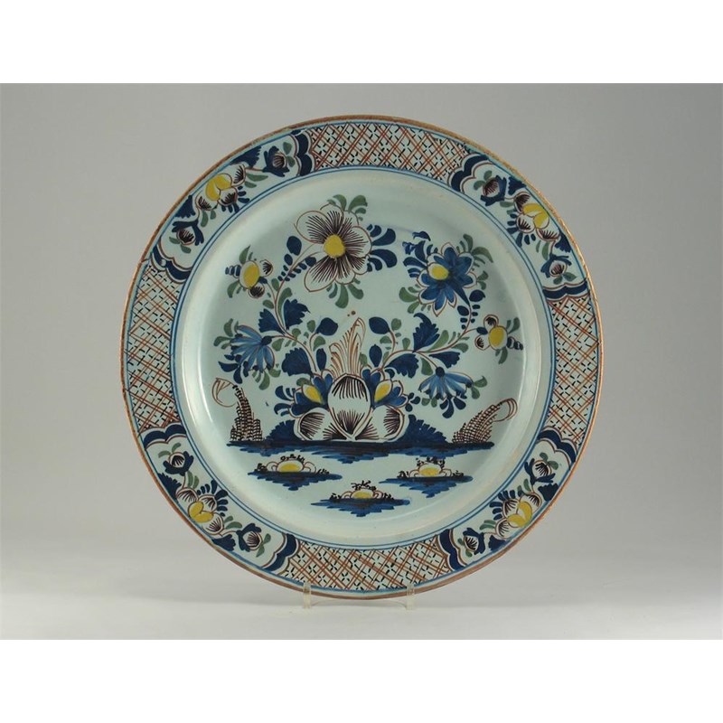 A large Delft polychrome plate, boldly decorated with flowers issuing from stylized rockwork. A well restored rim section. 18th century, 35.5cm.