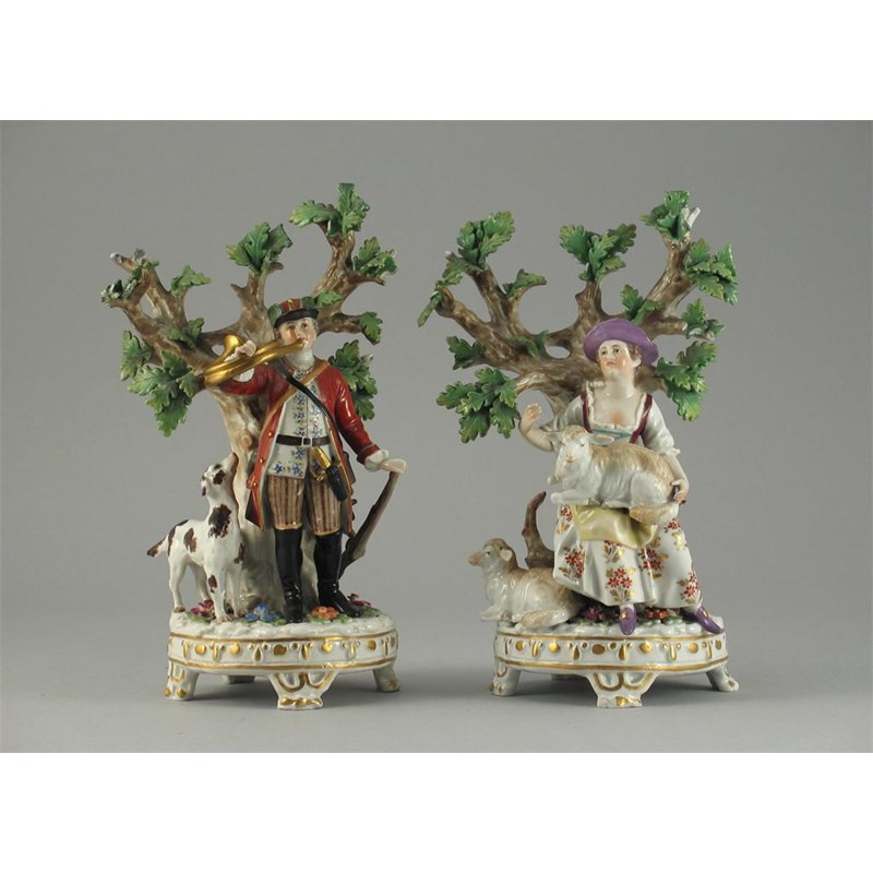 A pair of continental porcelain models, of a huntsman and companion, each before a leafy tree, he blowing a horn while his companion tends sheep. Chips to extremities. c.1900, 21.5cm. (2)