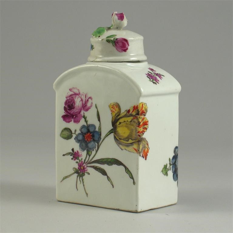 A Meissen rectangular tea canister, with an associated cover, well painted with colourful flowers, crossed swords mark. Chips to the knop. 18th century, 12.5cm. (2)