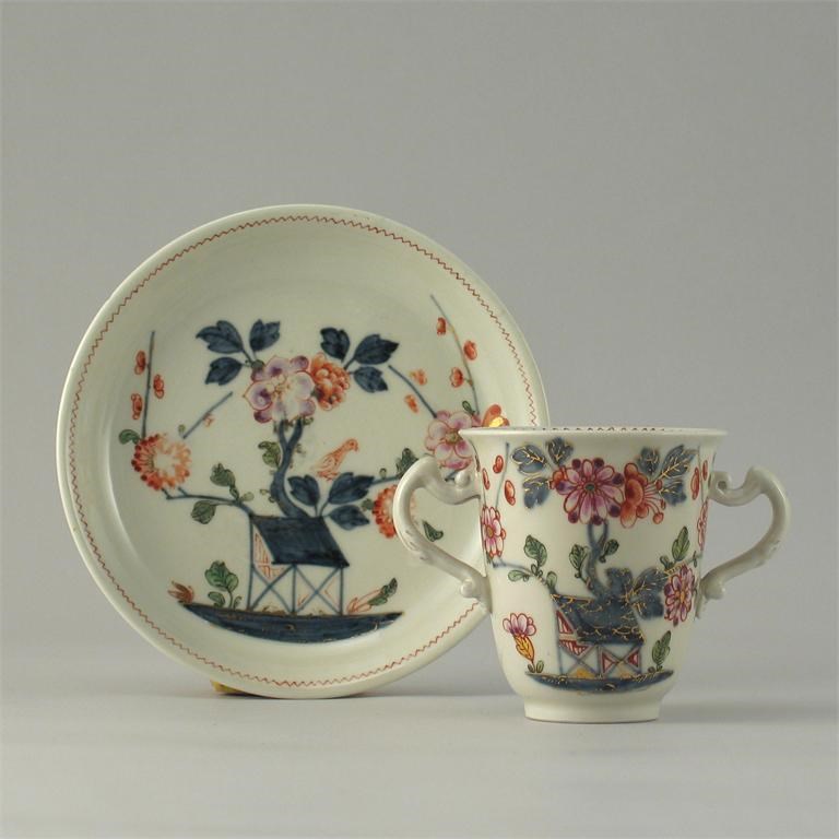 A Du Paquier two handled cup and saucer, painted in under-glaze blue and coloured enamels with flowers and leaves issuing from a small hut and with a tall vase of flowers, the saucer with three iron red flower sprays to the reverse, incised marks. A small rim chip and enamel wear to the saucer. c.1730. (2)