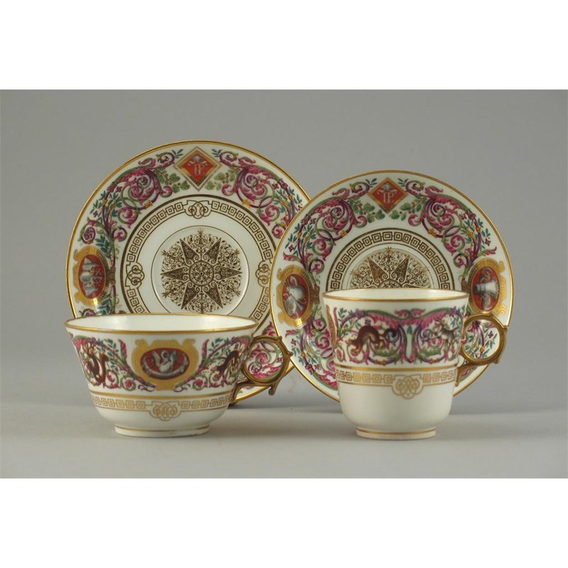 Two S style cups and saucers, decorated with wild animals and scrolling foliage, printed marks. (4)