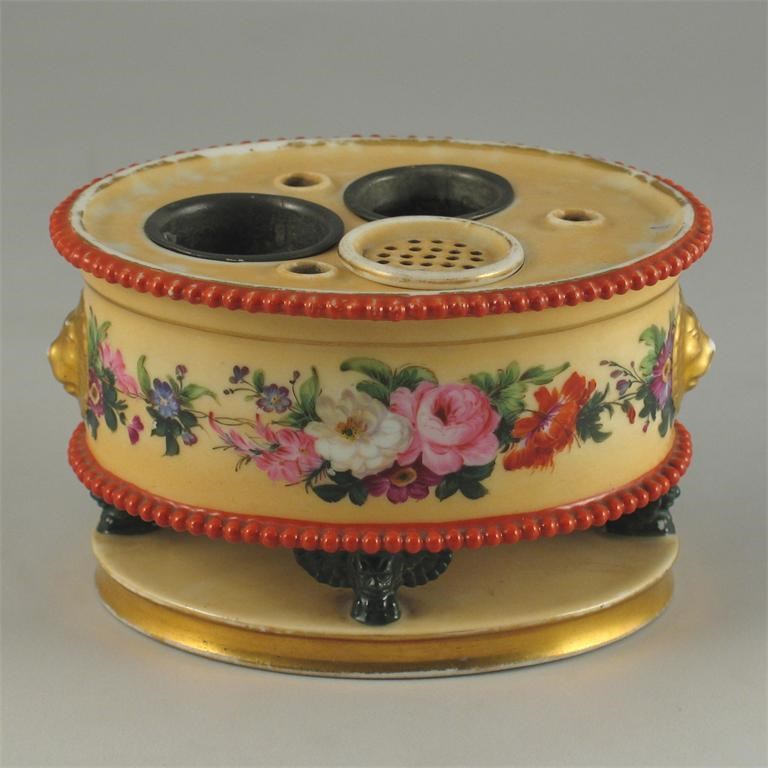 A French porcelain oval inkstand, with a detachable pounce pot and painted with a band of flowers on a butterscotch ground. Some wear and damage to the pounce pot. 19th century, 13.5cm.