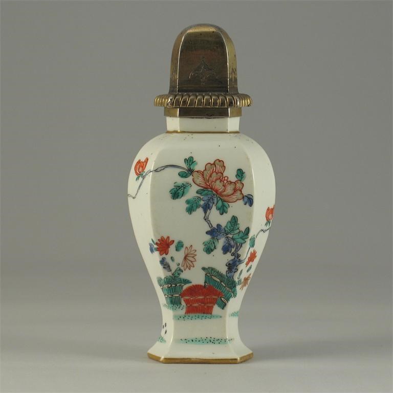 A Samson Chantilly style vase, with a silver-gilt cover, the hexagonal body painted in the Kakiemon style, horn mark, 19th century, 15cm. (2)