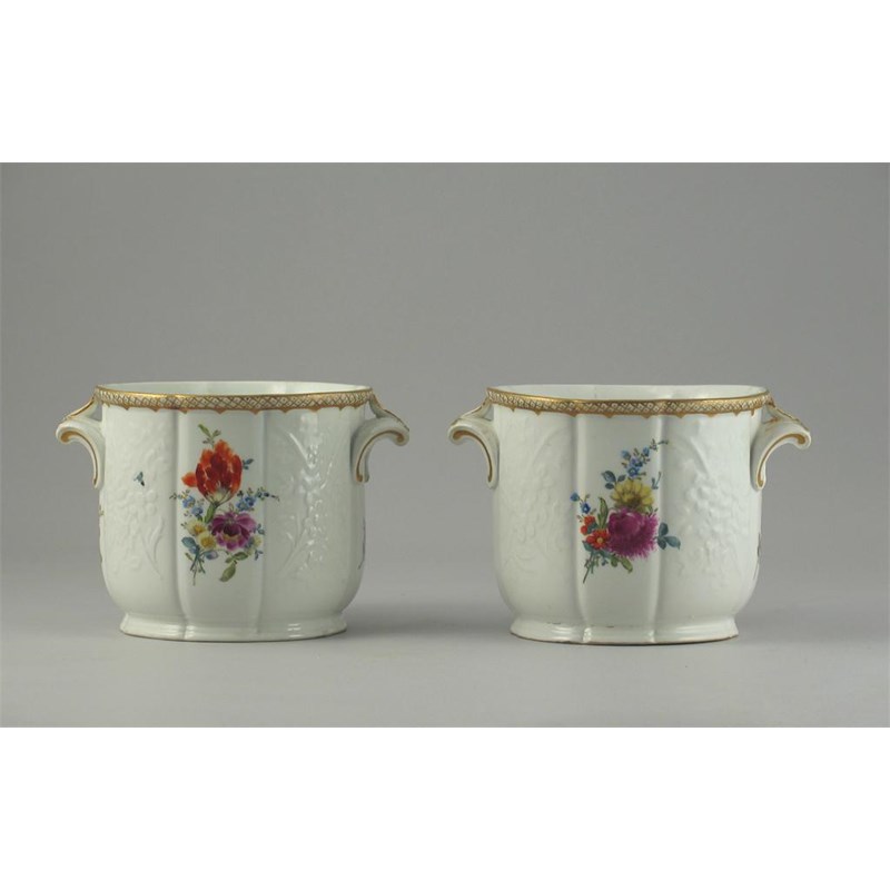 A pair of Meissen jardini moulded and painted with flowers