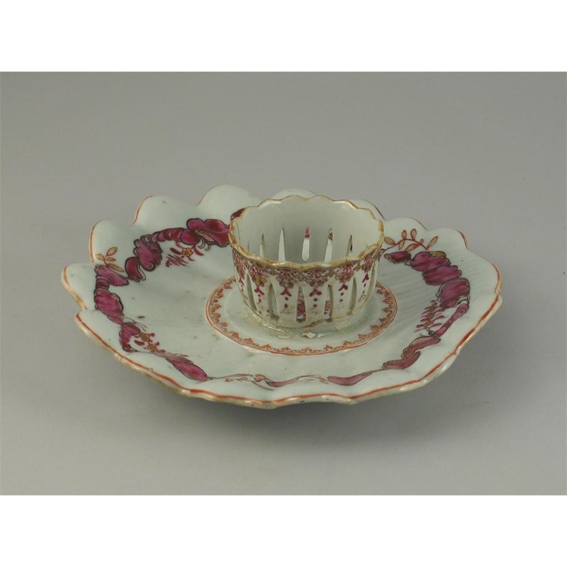 A Chinese famille rose stand, with a reticulated trembleuse holder and a fluted tray. Damaged. 22cm.