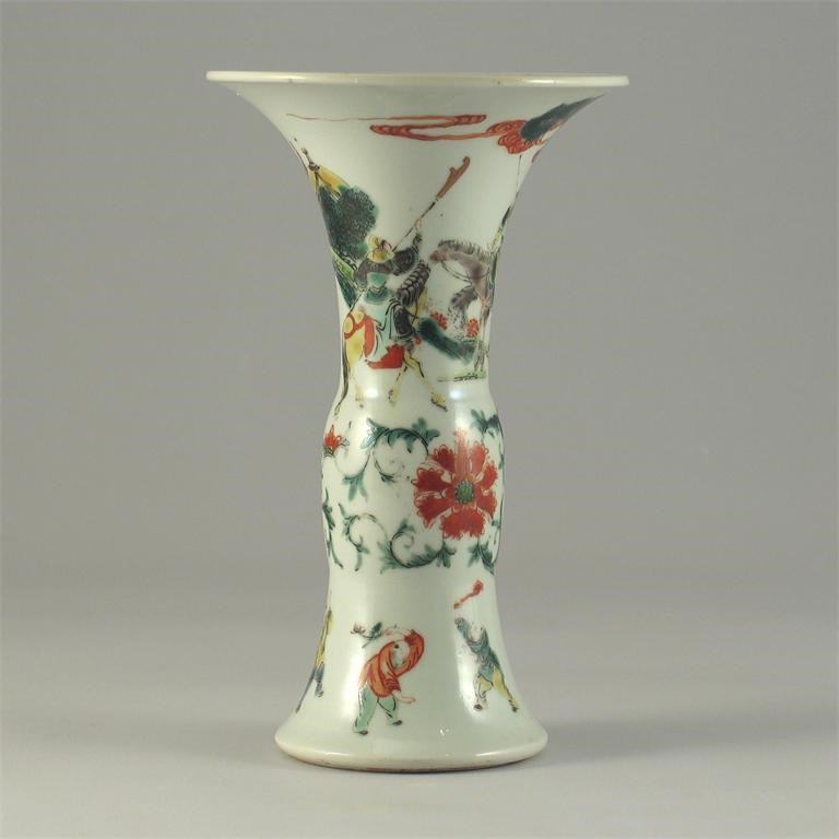 A Chinese famille verte gu-shaped vase, painted with fighting horseman beneath a pine tree above a flower scroll and a band of five boys to the base, 17cm.