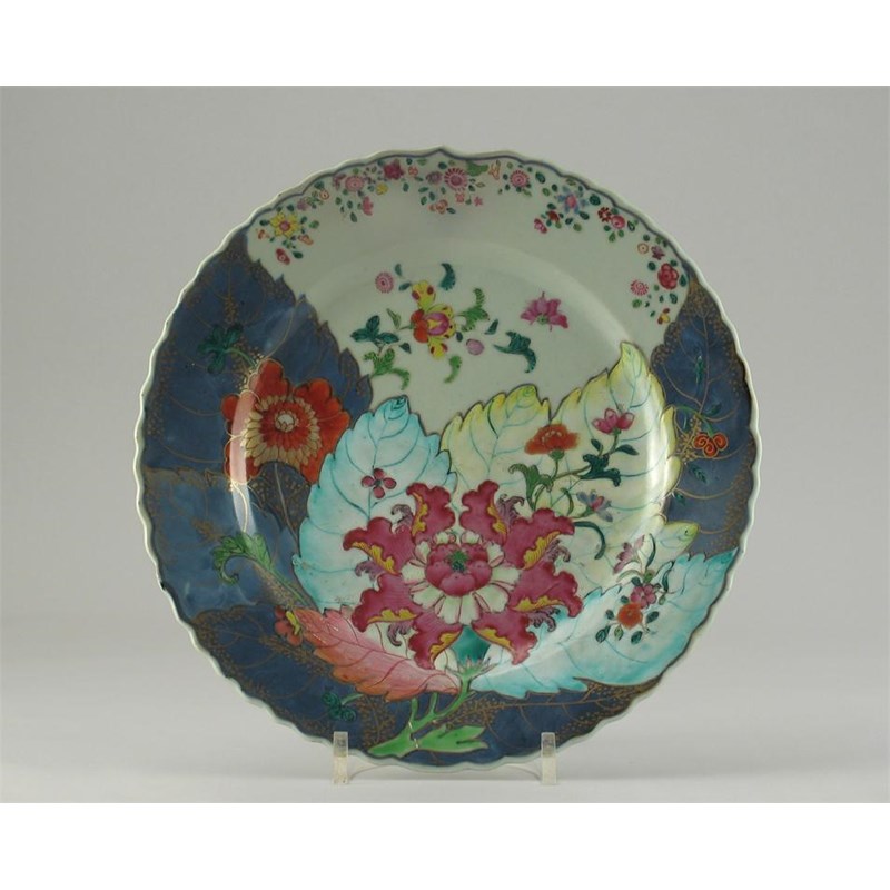 A Chinese famille rose tobacco leaf plate, with a shaped edge. A rim section restored. Qianlong 1736-95, 23cm.