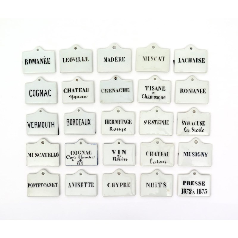 Twenty five Continental porcelain bin labels late 19th/early 20th century, of rectangular form, variously titled in black with different wines and spirits including 'Leoville', 'Chypre', 'Musigny', 'Muscatello', 'Crenache' and 'Hermitage Rouge', 7cm. (25)