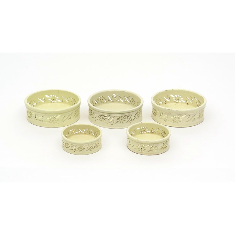 Three large and two small creamware bottle coasters c.1780-1800, the straight sides pierced with a continuous flowerhead design beneath a raised beaded band, 14cm dia max. (5)