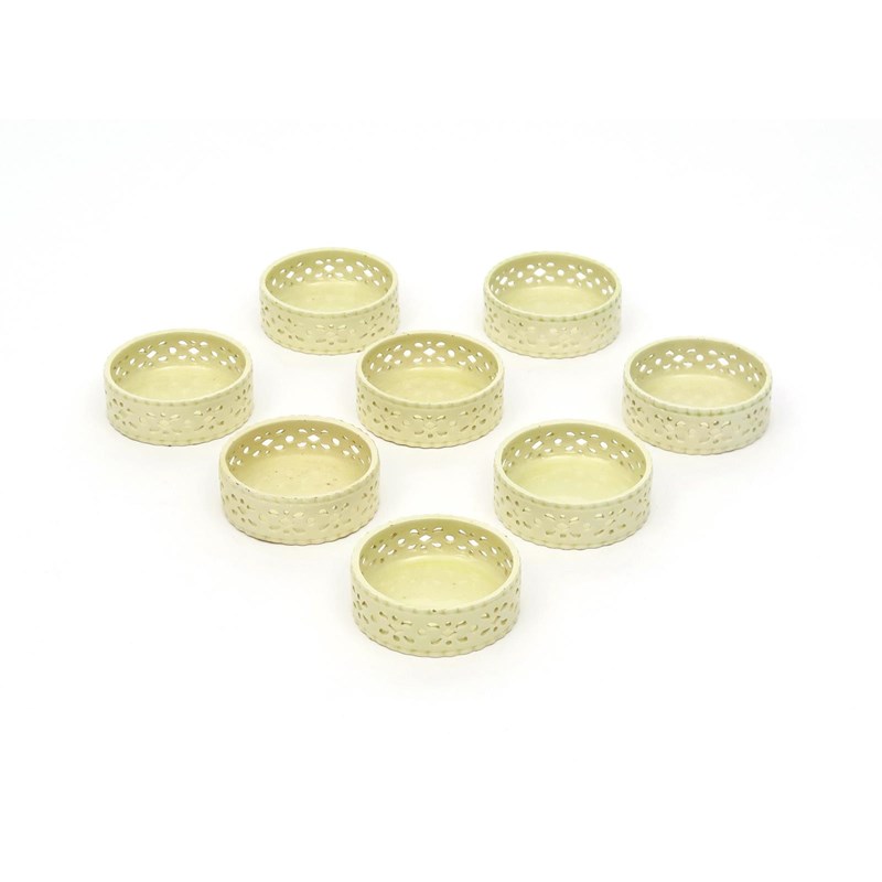 A good set of small creamware bottle coasters late 18th century, Staffordshire or Yorkshire, the flat cylindrical forms pierced to the sides with a continuous stylized floral band, 8cm dia. (8)