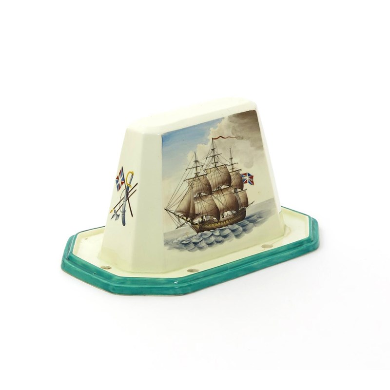 A creamware jelly mould core late 18th/early 19th century, possibly Wilson, of canted rectangular form, painted to one side with a three-masted ship at sail in a choppy sea, the sides and reverse with military trophies and motifs, the base pierced with six holes and edged in green, a crack around the base, 26cm across.