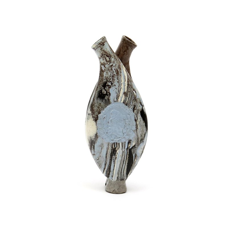 An agateware gimmel flask 19th century, one side moulded with a medallion containing a profile portrait within laurel branches, in pale blue reserved on a striated ground of blue, brown and grey, 20cm.