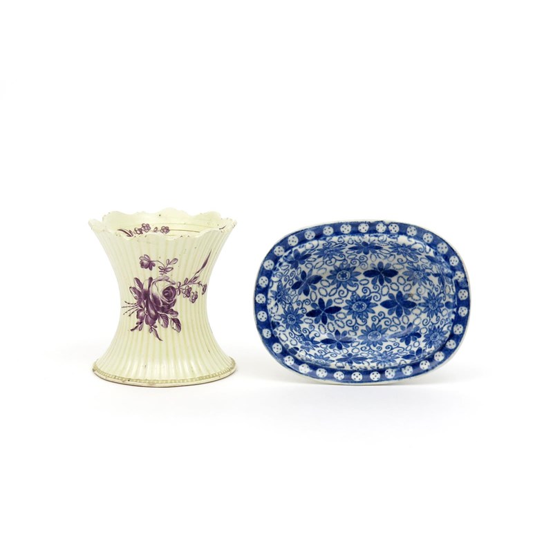 A creamware pounce pot c.1770, the waisted form finely fluted and painted in purple monochrome with flower sprays, the concave top pierced with small holes within a shaped rim, and a miniature pearlware serving dish printed in blue with flowers, 9.3cm max. (2)