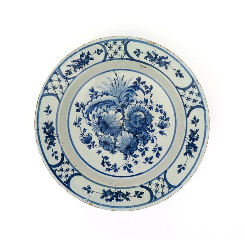 A large London delftware charger c.1770-80, painted in blue with an arrangement of roses and other flowers, the rim with five panels of further flowers reserved on a hatched diaper ground, some glaze chipping, 35.5cm.