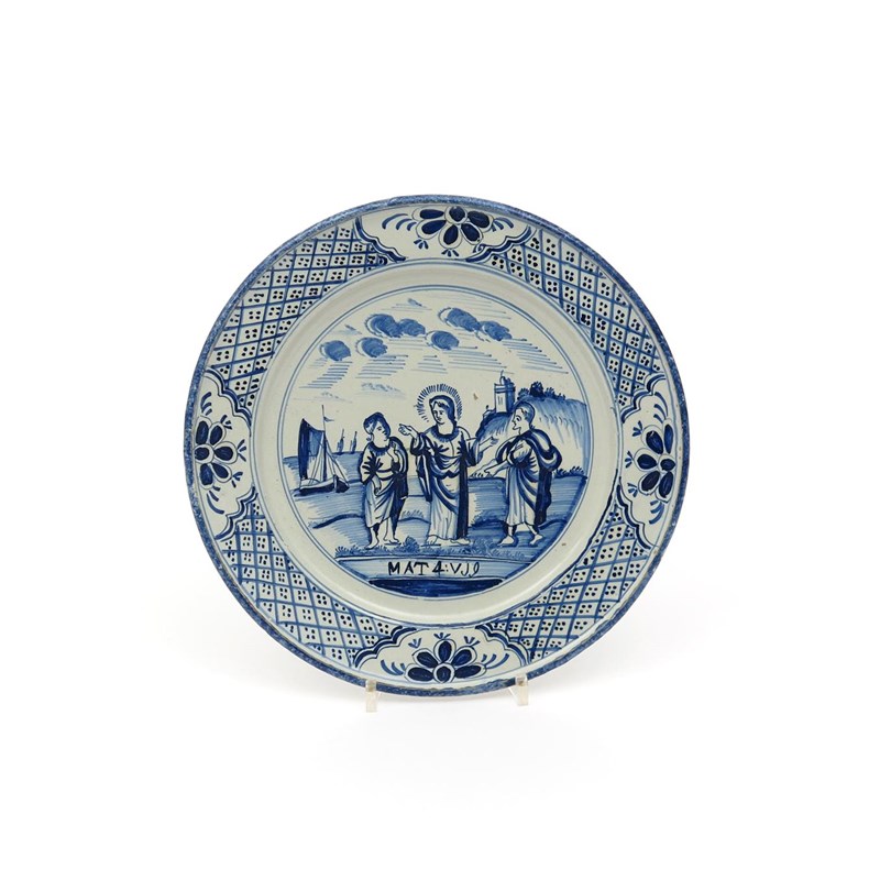 A Delft Biblical plate dated 1788, the well painted with a scene of Jesus with Simon (Peter) and his brother Andrew from Matthew 4:19, the rim with four panels of flowers reserved on a hatched diaper ground, incised 'AA 1788' to the base, 23.3cm.