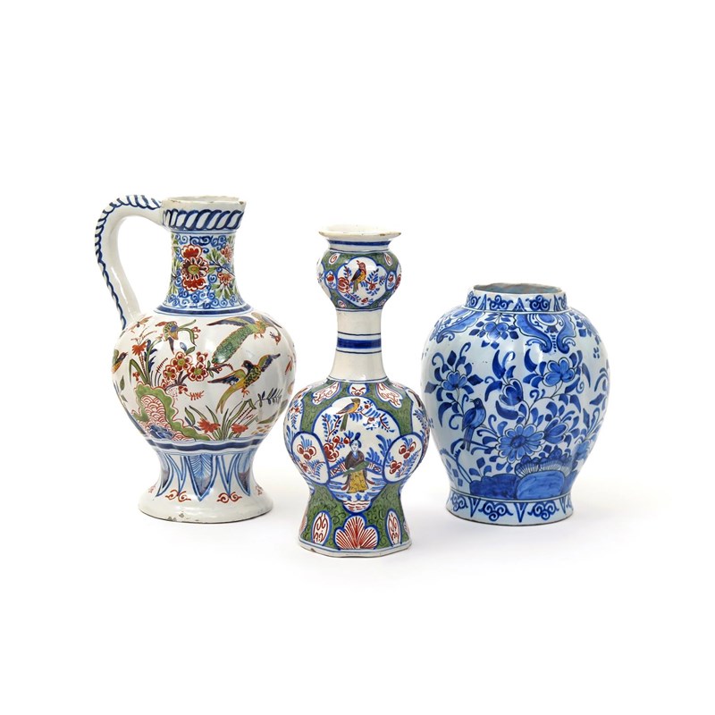 Two Delft vases and a ewer 18th/19th century, one ovoid and painted in blue with birds perched on flowering branches, the other of baluster shape with a knopped neck, painted in polychrome enamels with Chinese figures and birds in panels, the ewer with a peacock, swan and other birds amidst Oriental flowers above a stiff leaf border, AK marks to two, 29cm max. (3)
