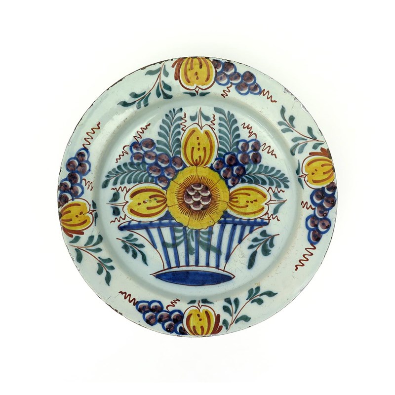 A large Delft dish or charger c.1740-60, painted in bold polychrome enamels with a basket of fruit and flowers, the rim with four similar sprays, some glaze chipping, 34.7cm.