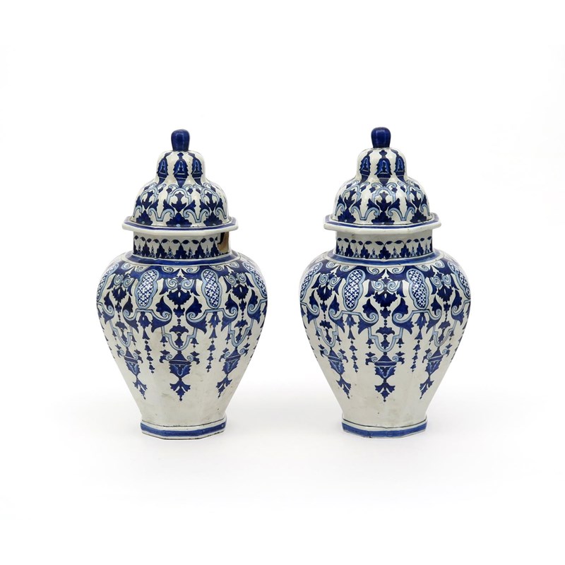 A pair of French faïence vases and covers late 19th century, probably Quimper, the octagonal forms painted in shades of blue with a formal foliate design between shaped diaper panels, HB monogram marks, a large chip to one rim, 33cm. (4)