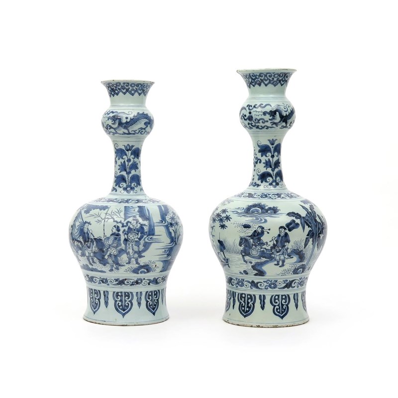A near pair of large Dutch Delft vases late 17th/early 18th century, the baluster bodies rising to slender necks with an onion knop, painted with scenes of Chinese figures at various pursuits in landscapes above a stiff leaf border, the knopped necks with dragons chasing flaming pearls, marked 7 to the undersides, the larger with restuck sections to the rim, 44.5cm max. (2)