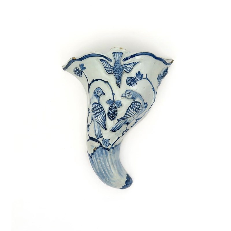 A Liverpool delftware wall pocket mid 18th century, the cornucopia shape moulded with three birds converging on fruiting branches, detailed in blue, good restoration to one side, 21cm.