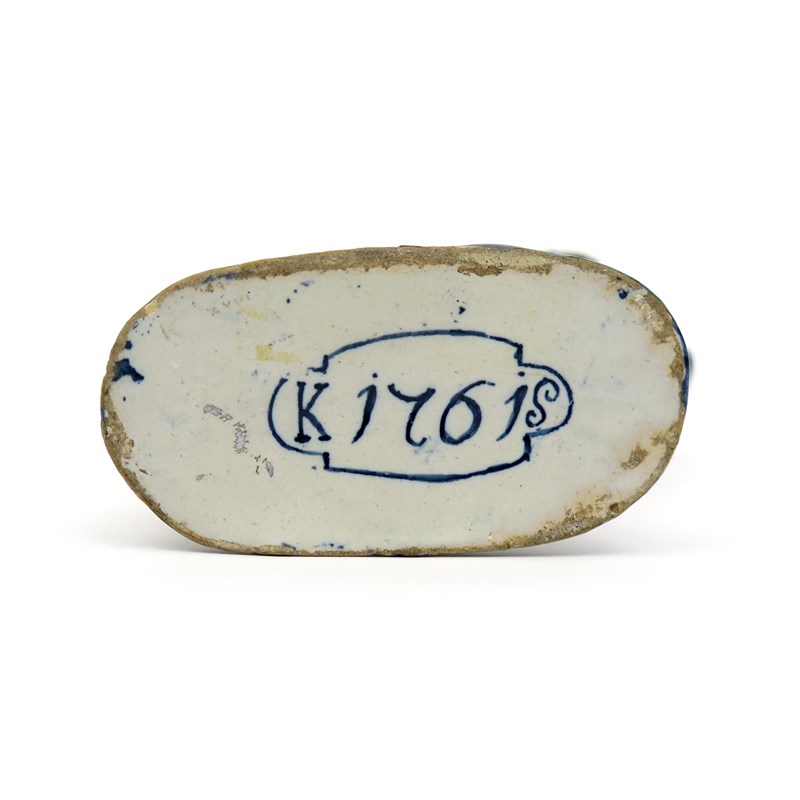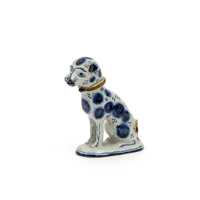 A delftware model of a dog dated 1761, seated on its haunches on an oval pad base, its head slightly turned, the coat decorated with blue wheels of fire and small dots, wearing an ochre collar with manganese stud, the tail enamelled in ochre, inscribed 'K 1761 S' to the underside, some glaze chipping, 12.5cm.