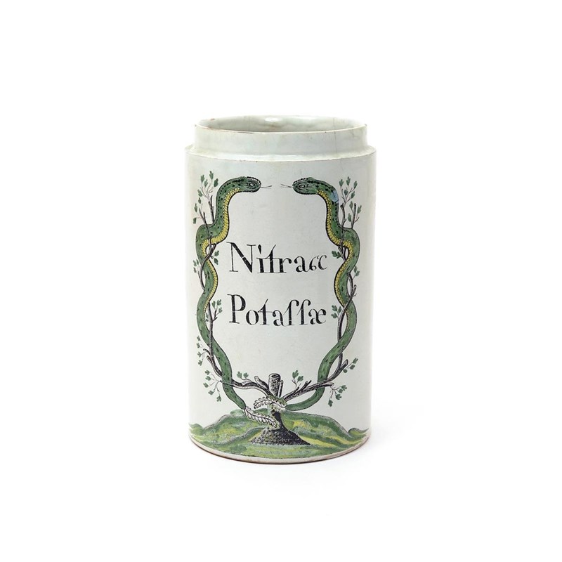 A French faïence albarello late 18th century, Paris or Rouen, the large cylindrical form painted in green, yellow and black with two snakes entwining around narrow branches, flanking the inscription 'Nitraec Potassae', restored, 26.7cm.