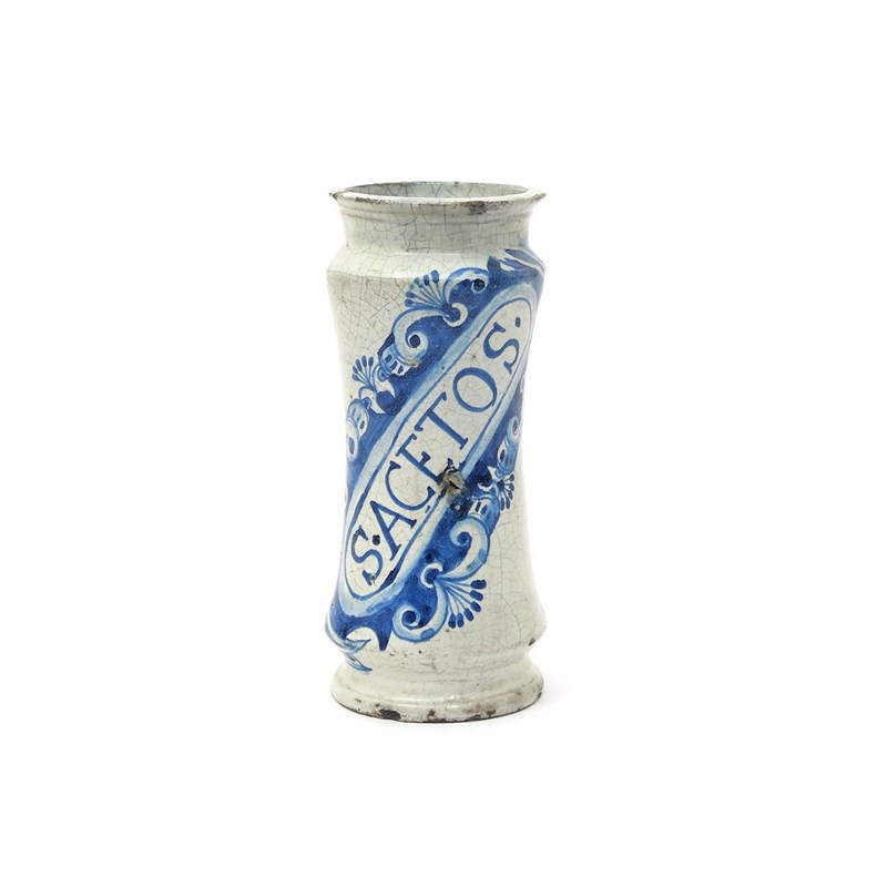 A Portuguese faïence albarello late 17th century, of tall waisted form, painted in blue with a diagonal cartouche inscribed 'S. ACETOS', within a simple scroll design, some damages, 24cm.