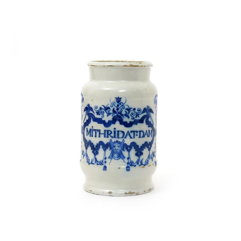 A Continental faïence drug jar early 18th century, Belgium or Northern France, painted in blue with a shaped cartouche inscribed 'MITHRIDAT.DAM', each side with a larged stylized carnation beside a bird with outstretched wings, broken and well restored, 19.3cm.